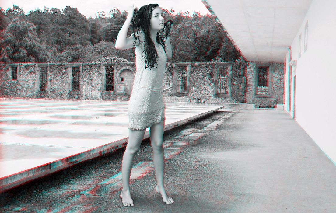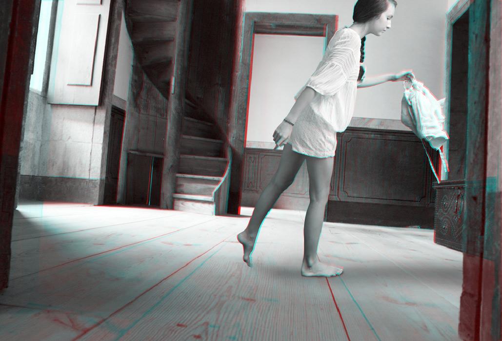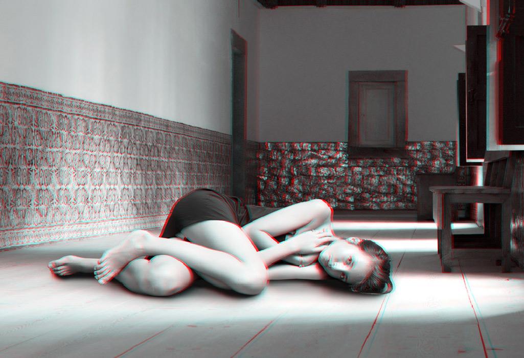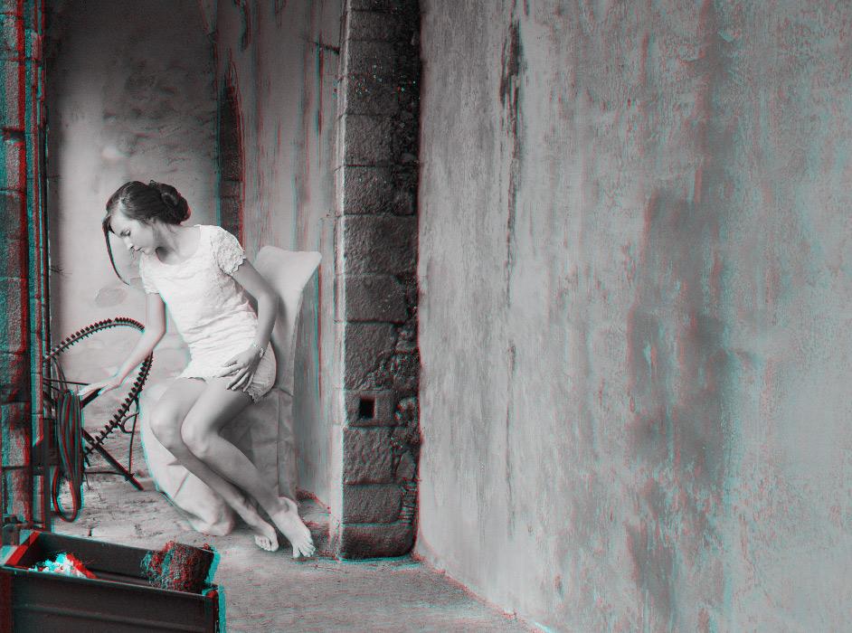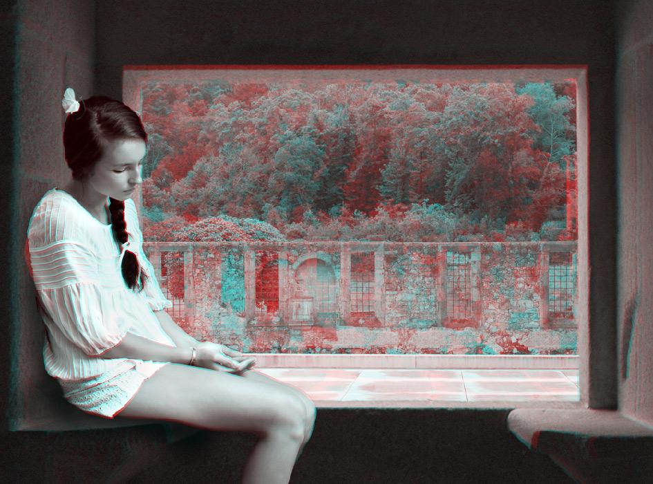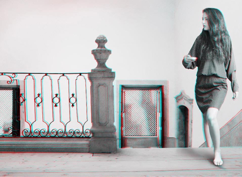 The anaglyph process uses a stereoscopic method in order to recreate 3D binocular perception by using images and complementary colour filters where one of the images is red and the other cyan; if they are then observed together through a filter of the opposite colour, the image appears in relief, at the same time three-dimensional and virtual, whereas it already exists, detached, as a two-dimensional image. Confusing at first, the use of this ancient device is nonetheless central to Mireille Loup’s approach; it produces the very materiality of the images created (their transparency, their plasticity), but also their possible readings, literal and symbolic. The sensory experience of the 53.77 series mediates two simultaneous points of view, as the depth effect is linked to the distance between the original image and its double; it is this phenomenon of diplopia that is constantly re-adjusted by the movements of the viewer. Far from being a formal game, this very technique fully reveals the aesthetics of the undecidable narrative that characterizes this photographic series, and has probably determined the work of the artist for over twenty-five years.