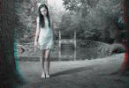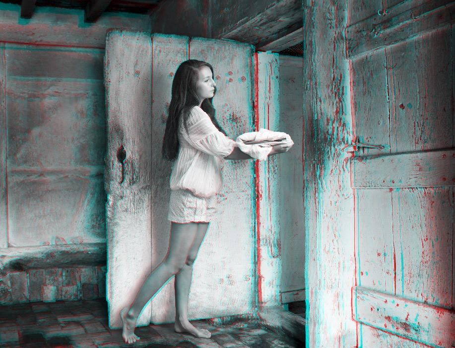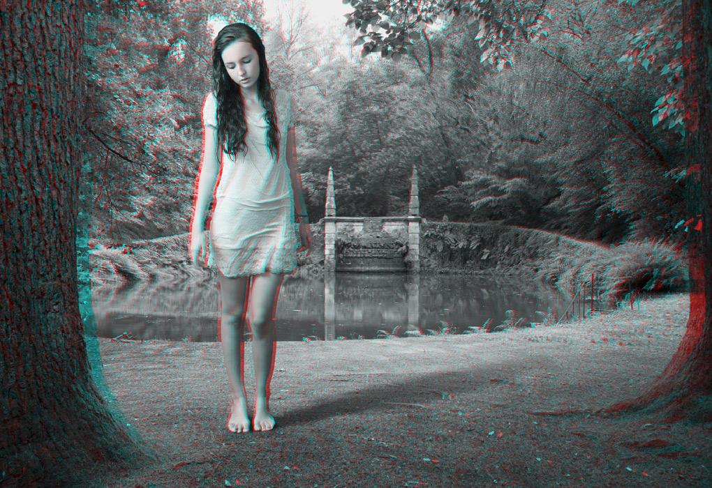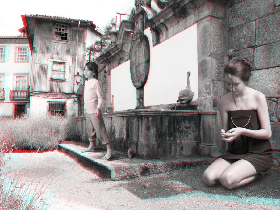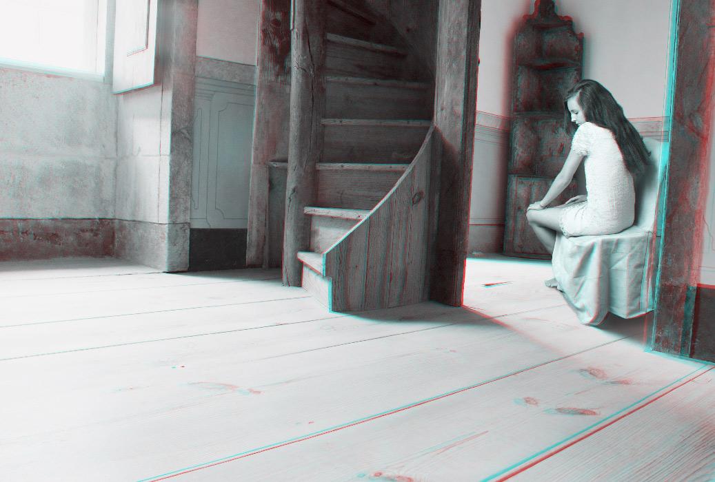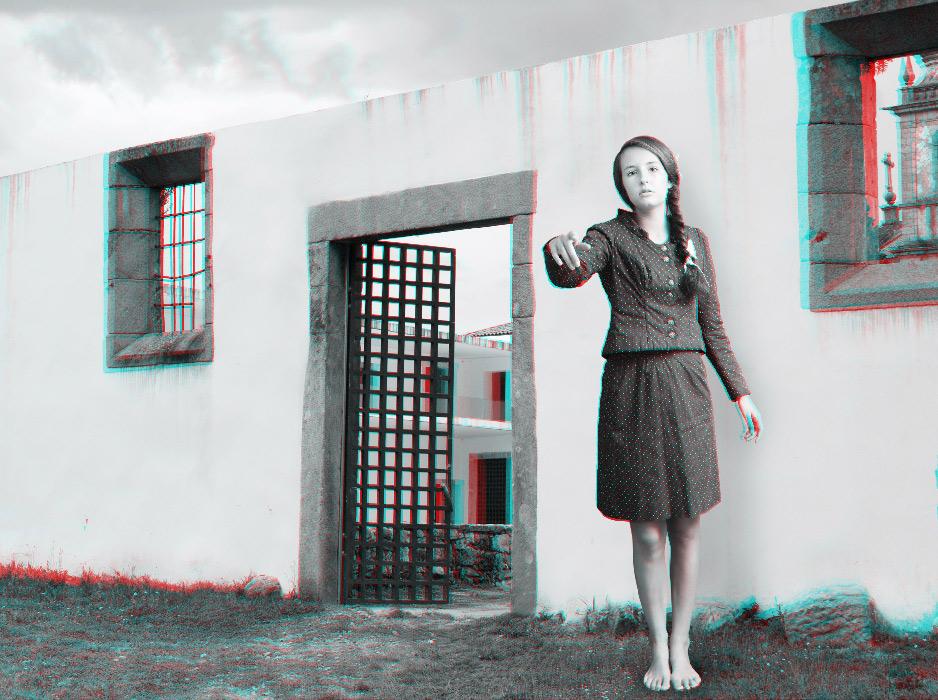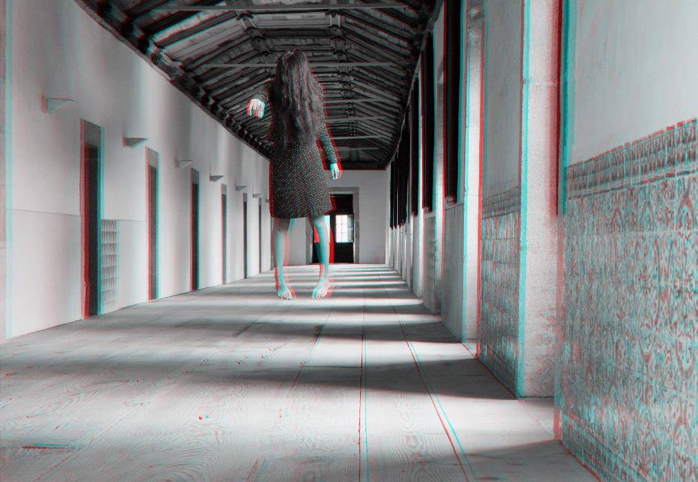 The anaglyph process uses a stereoscopic method in order to recreate 3D binocular perception by using images and complementary colour filters where one of the images is red and the other cyan; if they are then observed together through a filter of the opposite colour, the image appears in relief, at the same time three-dimensional and virtual, whereas it already exists, detached, as a two-dimensional image. Confusing at first, the use of this ancient device is nonetheless central to Mireille Loup’s approach; it produces the very materiality of the images created (their transparency, their plasticity), but also their possible readings, literal and symbolic. The sensory experience of the 53.77 series mediates two simultaneous points of view, as the depth effect is linked to the distance between the original image and its double; it is this phenomenon of diplopia that is constantly re-adjusted by the movements of the viewer. Far from being a formal game, this very technique fully reveals the aesthetics of the undecidable narrative that characterizes this photographic series, and has probably determined the work of the artist for over twenty-five years.