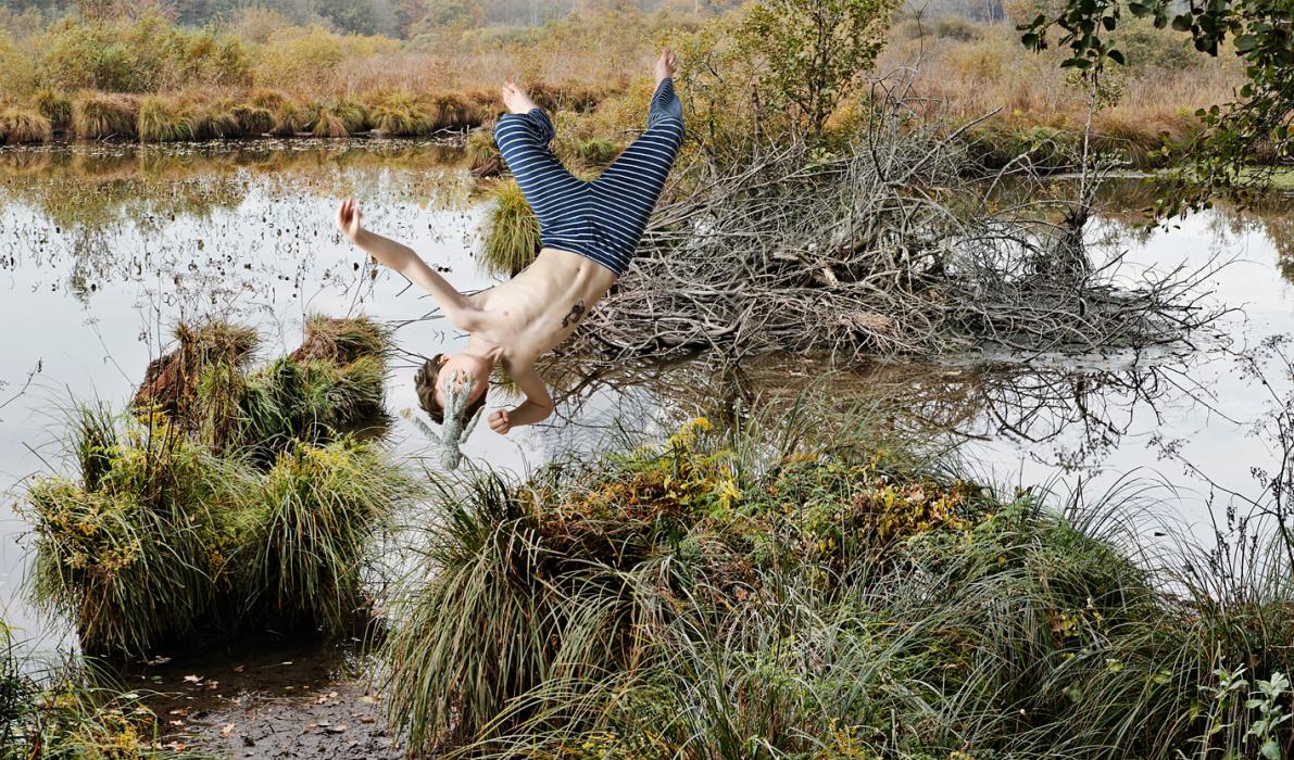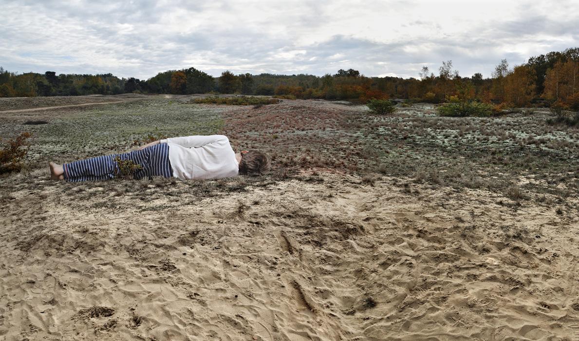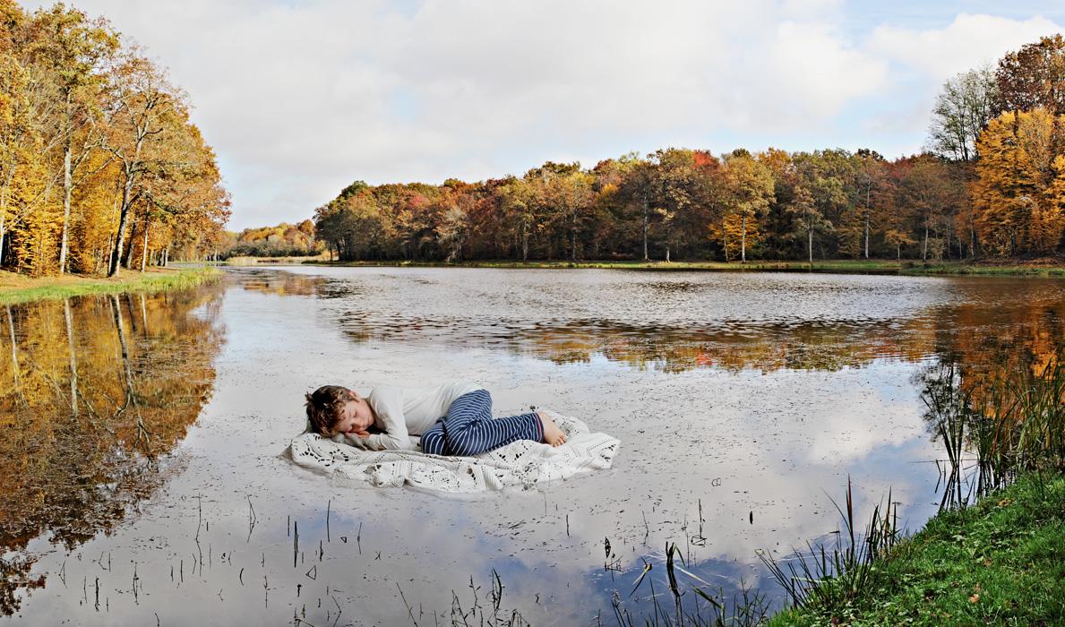 Sometimes he extracts himself from his underlying universe by projecting himself inside wide panoramic landscapes, this time beyond the real world. He falls into marshes, head first, as if diving into another level, he falls asleep on water using his blanket like the leaves of a water lily, or on the mossy part of a sandy desert, constantly estranged from the world.