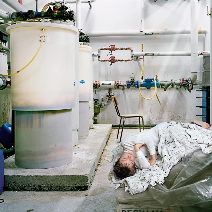 On a pile of work bags close to the water tanks of a boiler room in an industrial building, a young boy is asleep. Later, he waits in the scullery of a communal kitchen, then resumes his somnambulist walk in the basement of the building.