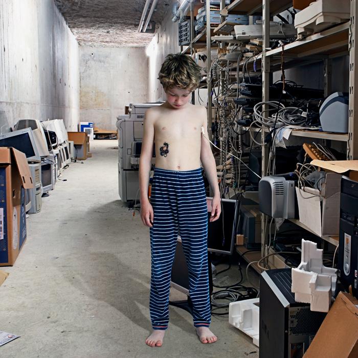 He has no contact with anyone. Neither adults nor children come across this boy. He roams through the corridors of a seemingly abandoned place, between stacked computers, raw concrete, metal structures and rubble. An uncomfortable and cold decor where only neon lights and LEDs guide the barefooted child.