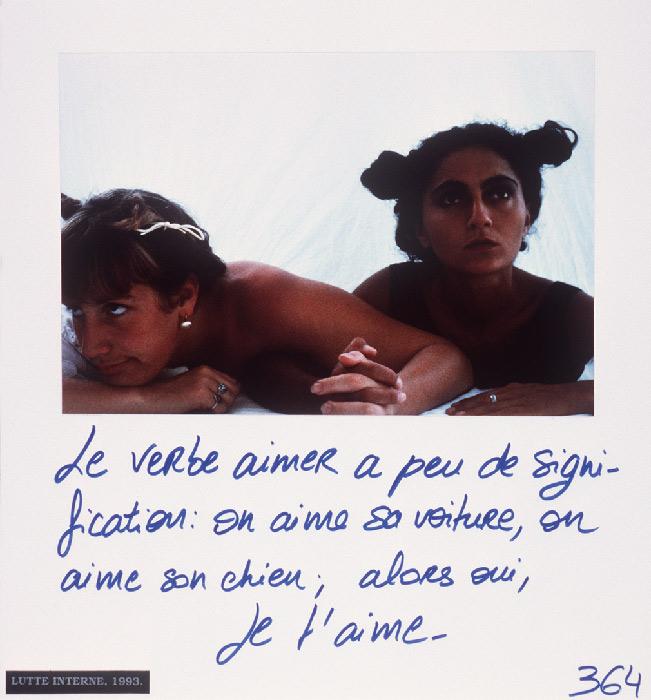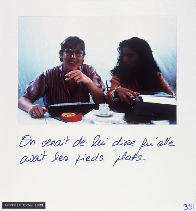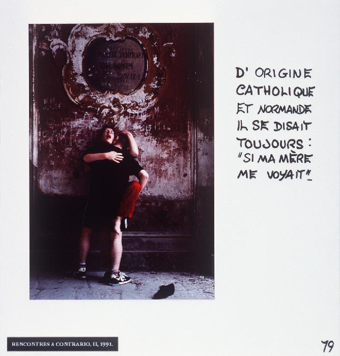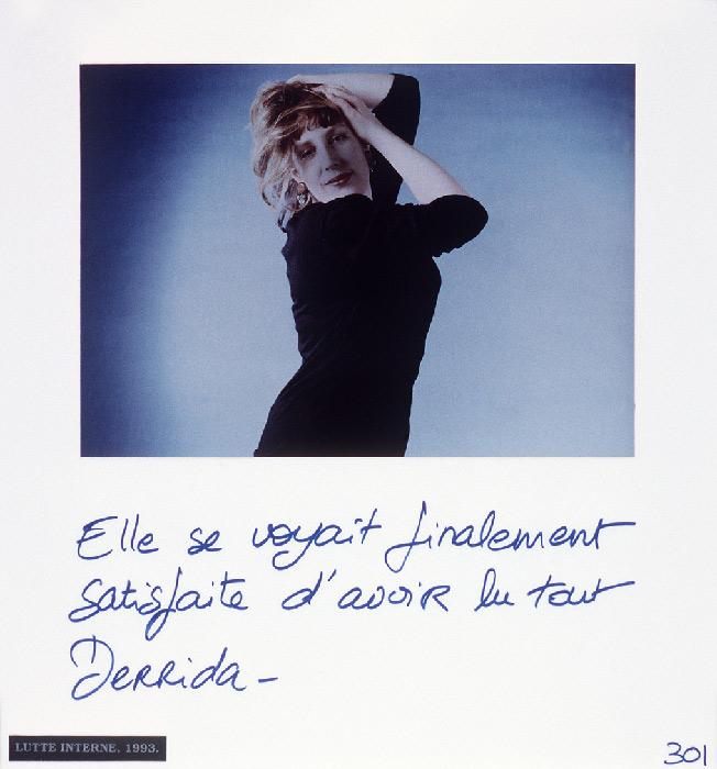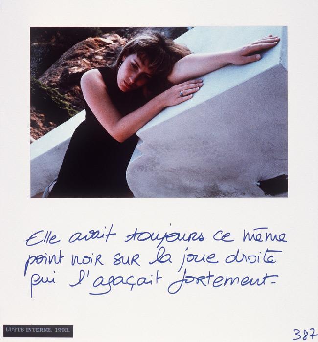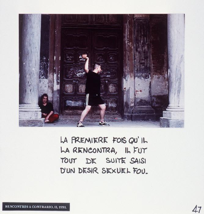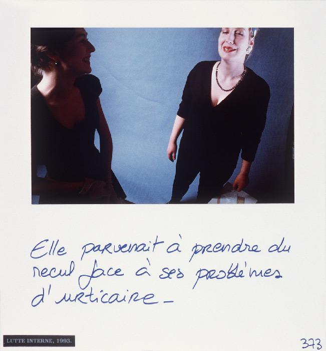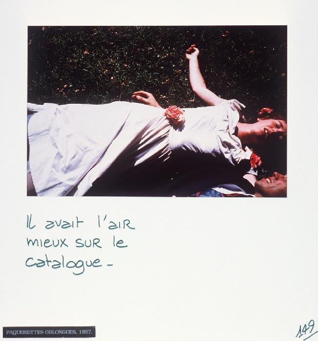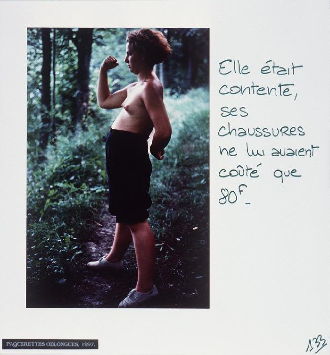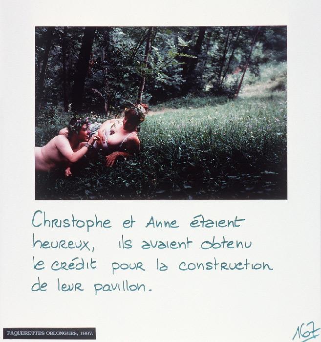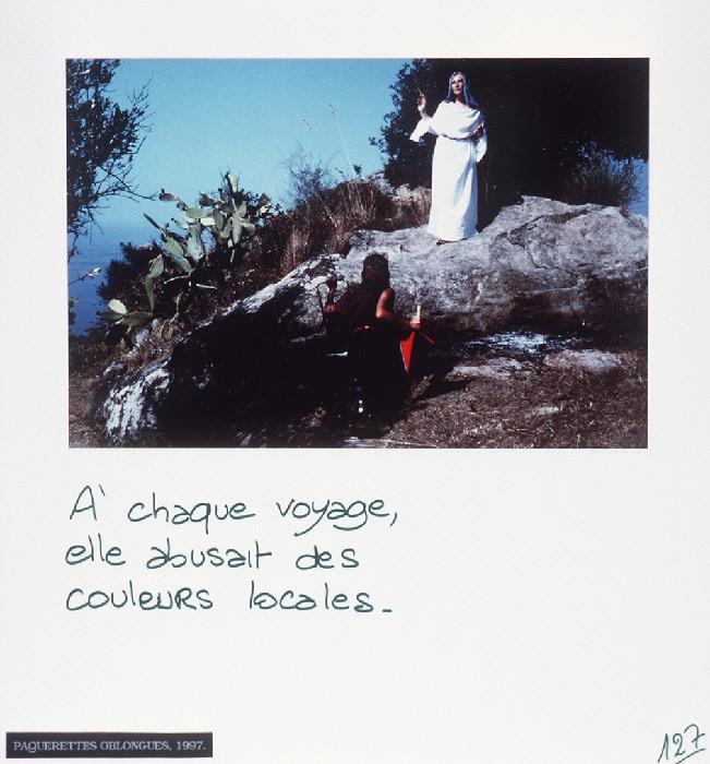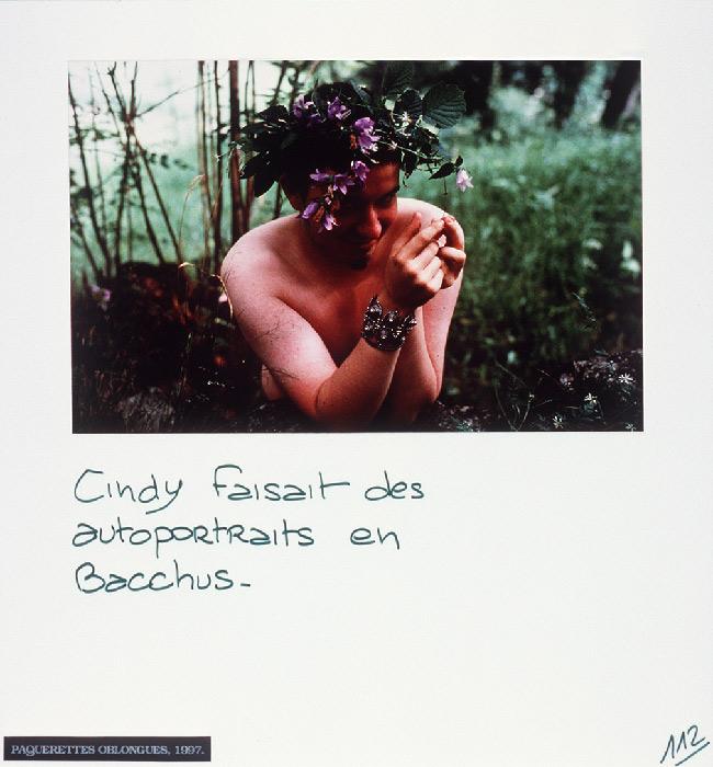 “Mireille Loup practices the art of the scenario with ease. Christophe, Anne, ma photographe et leurs amis (1991-97) gathers six micro-fictional accounts, originally conceived as storyboards. The photographs show characters inspired from her autobiography, to whom the artist attributes absurd legends or allusions to contemporary references: Cindy faisait des autoportraits en Bacchus.”
