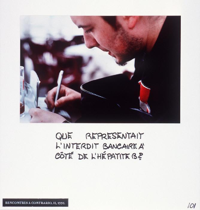 32 photographs in 6 series, cibachrome prints H 16 X L 24 cm and H 24 X L 18 cm, pasted on white plexiglas H 32 X L 30 cm, text in Promarker.