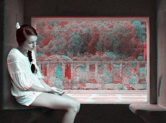 Afin de recréer la perception du relief binoculaire à partir d’images et de filtres en couleurs complémentaires, le procédé anaglyphe s’appuie sur un couple stéréoscopique dont l’une des images est tirée en rouge, l’autre en cyan ; si on les observe ensemble, à travers un filtre de la couleur opposée, l’image apparaît en relief, tridimensionnelle et virtuelle à la fois, tandis qu’elle existe déjà, flottante, en deux dimensions.